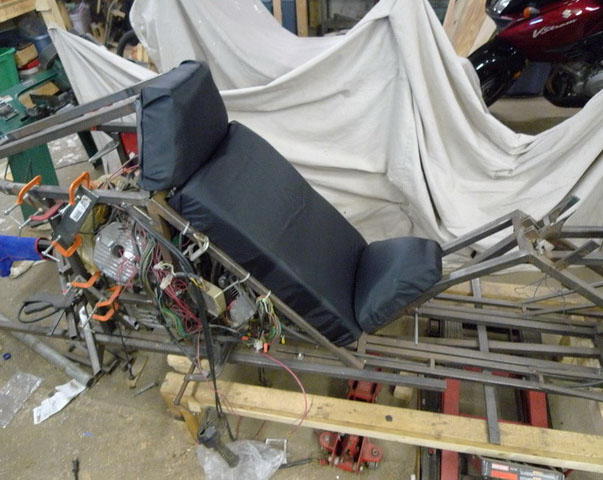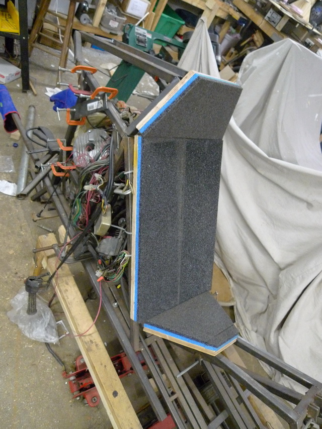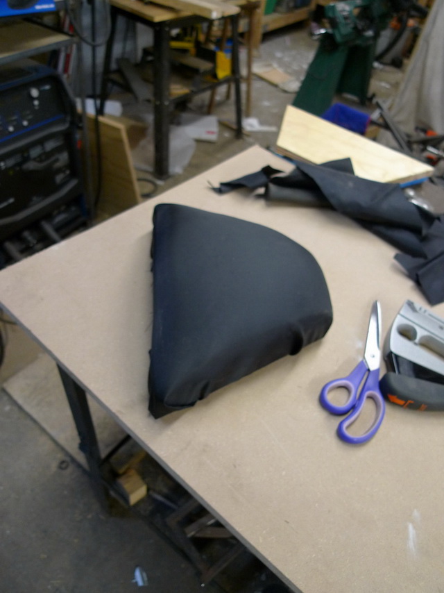 In the interim I made a new seat for the prototype. First is the new shape, cut out of 3/4" backing plywood and a two layer dense foam I had lying around.