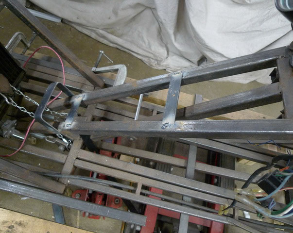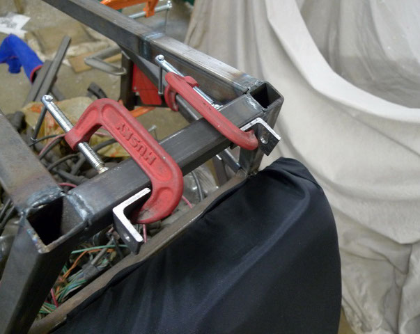 I then welded complimentary brackets onto the motorcycle frame, here are two of them jigged up