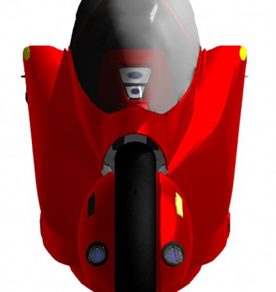 A straight on view, which shows the low speed stand deployed. I added two small running lights to the lower part of the front wheel cowling, along with the headlights this would create a distinct triangular lighting pattern. The yellow reflectors are required by USDOT regulations.