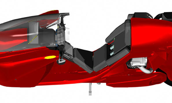 Here the cowlings are removed, and you can see the long massive single sided rear swingarm, along with a small electric motor used for engaging reverse.