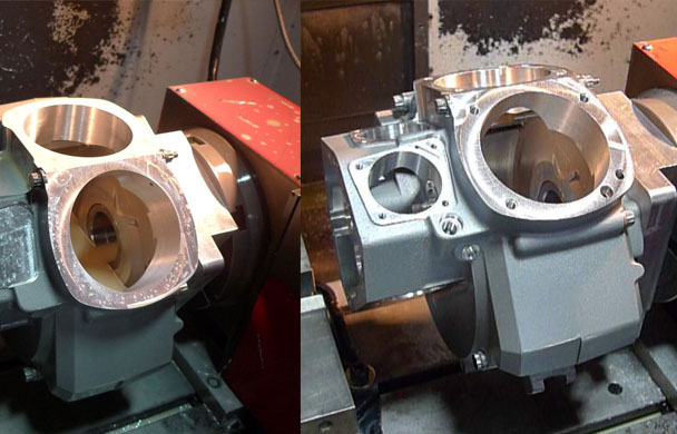 These are the motors we build, these are the engine cases, and this is a before and after of some of the 4th Axis machining operations. CNC machines can have an aribtrary number of Axis, they are not limited to the 3 you might think of in physics or cartesian co-ordinate systems. Basically like a typical axis it is any plane the machine can move along, so you have your conventional X,Y,Z axis, which is up/down, left/right, and forward/back. Basic machines are 3 Axis. In this machine we have a 4th axis installed, it is the red block on the side, it has a rotary table which the engine case is bolted to.