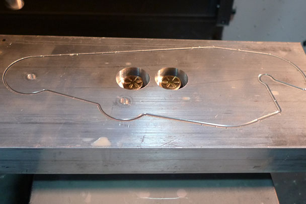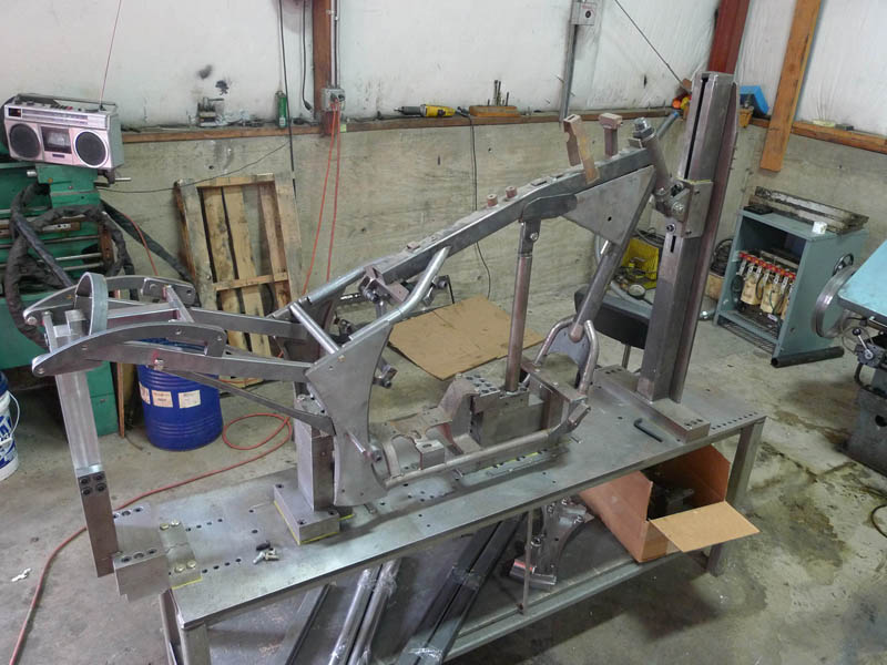 Here is our Jig with a frame in progress mounted into it. This is a good reliable jig with numerous rigid mounting points but which also allows for easily removing the entire frame after welding. A frame jig holds all frame parts in place while they are being welded together. This thing weighed probably 800 lbs. Ok, on to actually making some bike parts First up, I was unhappy with my front end parts and decided to remake them on the CNC, it would be a good part to learn on as well. First up, is the fixture for holding the part.