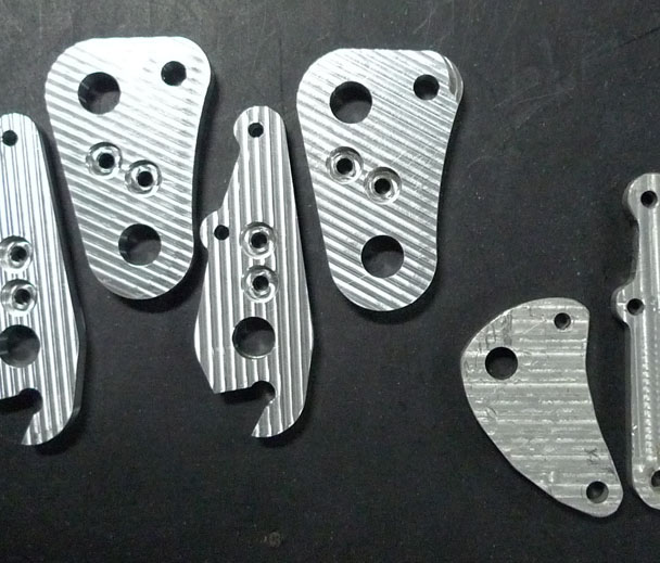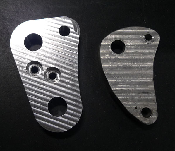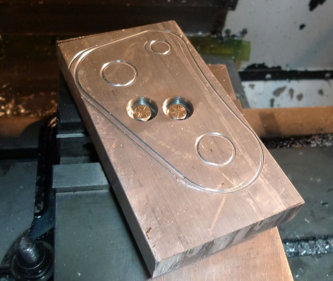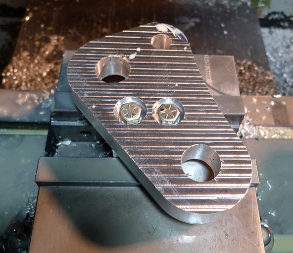 So here it is, completed. You can clearly see why it had to be held from below with a small block, because the machine cut the curved outer shape and holes all the way through the work piece, so you couldn't hold this with the vice grip from the edges. It turned out though that the piece could move a little no matter how much you tightened those bolts down. So this was a second piece and the block was remade with threaded holes instead of straight through holes