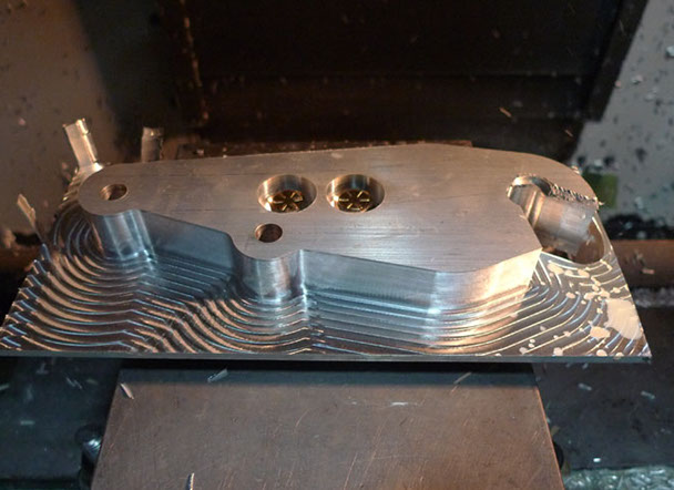 Almost done! Here I started to get concerned about how thin the aluminum section was getting. Worrying these pieces could suddenly break off and go flying. Instead of milling this down from the top, the way I did, it should have been milled from the outside in. Here our machinist re-programmed it to cut the correct safer way.