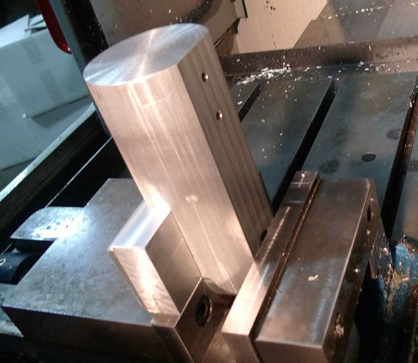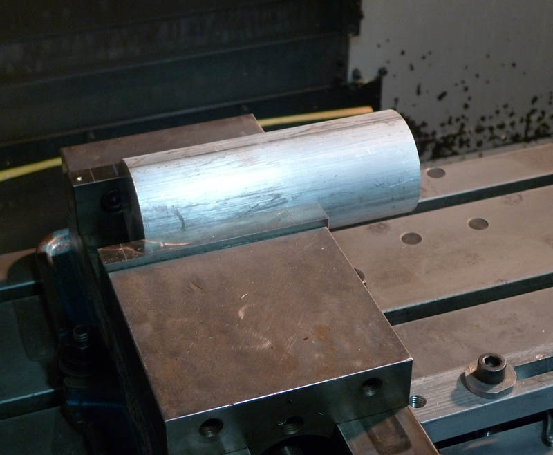 Next up was the fork ends. Again I was unhappy with the old ones, which were hand cast and of low quality. Here is a stock 3" diameter aluminum bar cut to length and clamped in the CNC vice.