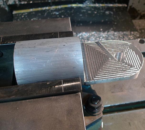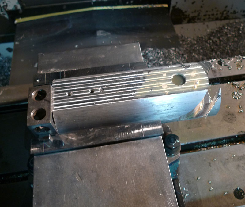 The top side is flattened now, some holes are drilled and tapped, and the rounded profile in the end is milled in.