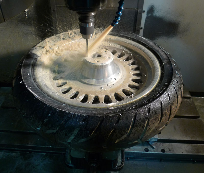 Next I glommed a tire / wheel from the shop, I wasn't happy with the tire / wheel combo I was using. Unfortunately this one only had holes for the brake rotor on one side, so we stuck it in the CNC and drilled and tapped 5 holes to make it a dual rotor.
