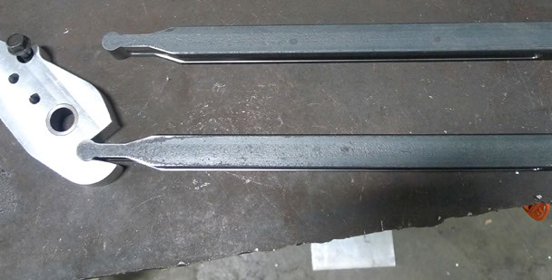 All done! Here are the two new leading links and the two new caliper mounts next to, on the right, the old leading link and old caliper mount. Honestly I stare at these sometimes I think they are quite beautiful.