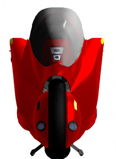 A straight on view, which shows the low speed stand deployed. I added two small running lights to the lower part of the front wheel cowling, along with the headlights this would create a distinct triangular lighting pattern. The yellow reflectors are required by USDOT regulations.