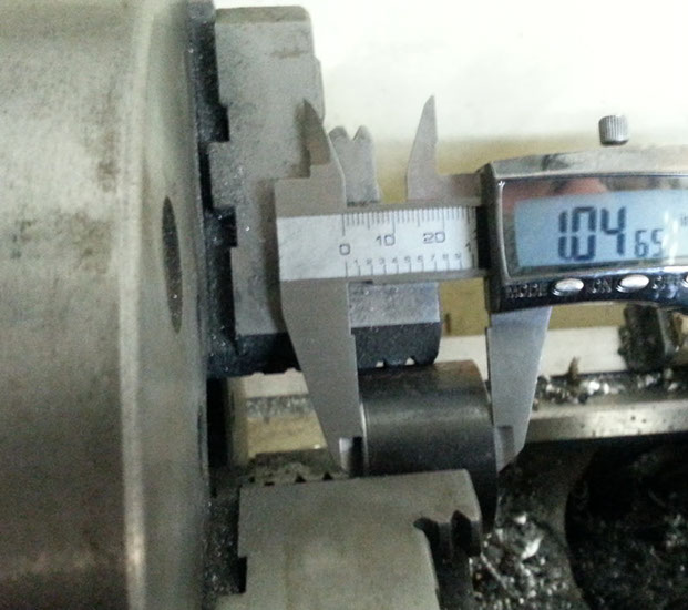 First was to close the gab between the outer fork tube (the larger diameter tube on the left of the calipers) and the lower tree of the fork (at the right side of the caliper) The gap came from some design modifications earlier. The gap is 1.04" ... onto the lathe.