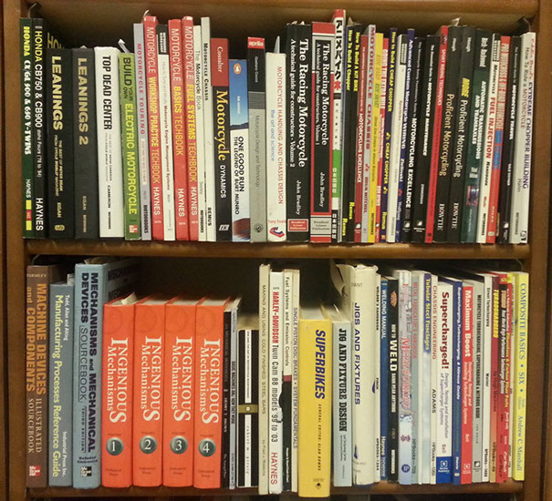 And here specifically are my motorcycle and design related books. The most valuable have certainly been the top shelf middle three, Tony Foale's "Motorcycle Handling and Chassis Design" and John Bradley's two books "The Racing Motorcycle - A technical guide for constructors" vol1 and vol2. Now back to the build...