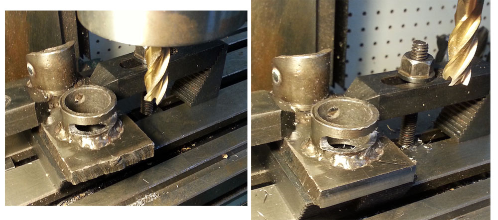 A major concern I have is the rigidity of the steering column. Because of the legacy of the design history, I went with a different configuration for my steering setup than the convention parallel bar fork tubes. This piece clamped into my milling machine is where the steering column meets the handlebar holders. Here I am enlarging the small hole into a larger groove, this is where I will weld the mount to the actual steering column. Beyond that, an internal mechanism will provide additional rigidity.
