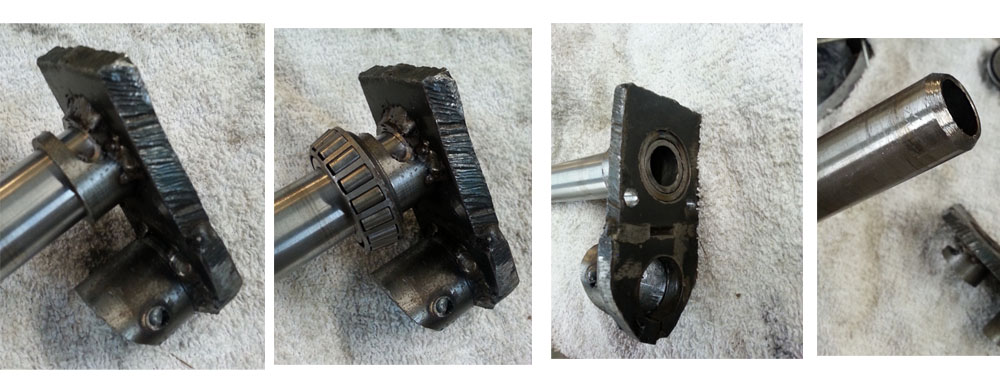 Here, on the left we see the steering column inserted into the handlebar mount. The next image shows where the steering column bearing sits. This is why I can not weld that side of the mount to the tube. However on the other side, in the 3rd image, you see how the steering column passes through to the other side. On this side, I will also weld it. In the fourth image, I beveled the end of the steering column tube to better facilitate welding it.