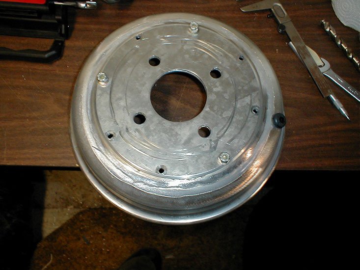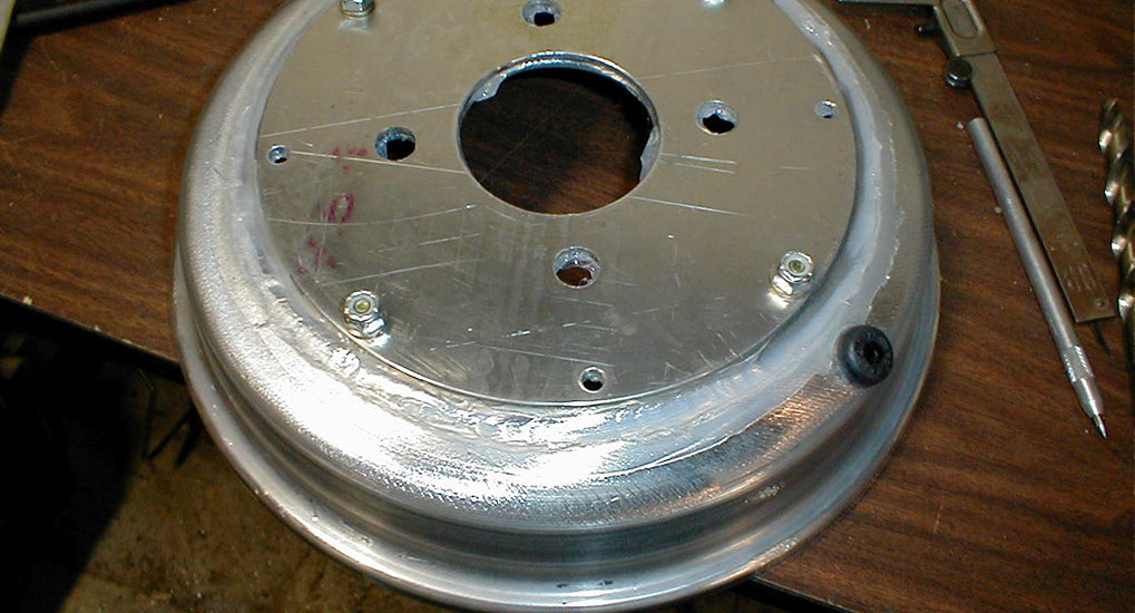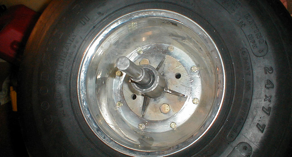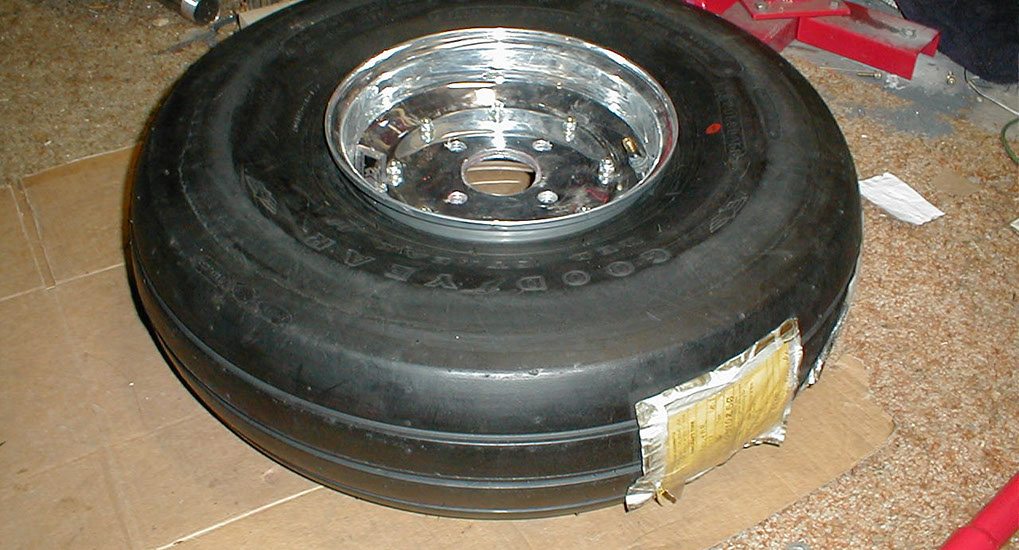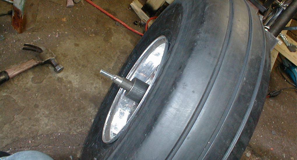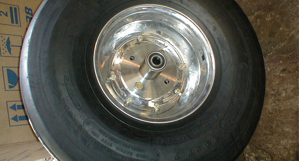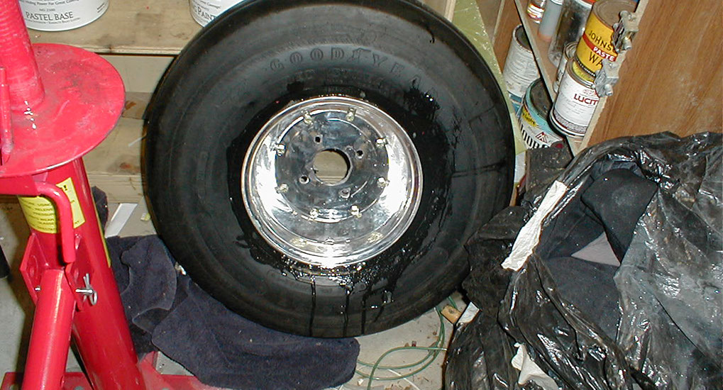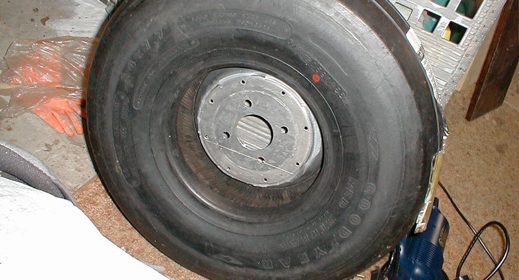 Sealing the hub mount plate to the rim with silicon. Split rims are much easier to mount, and I didn't have the hydraulic tire mounting machine for aircraft tires. But split rims are harder to get an airtight seal with.