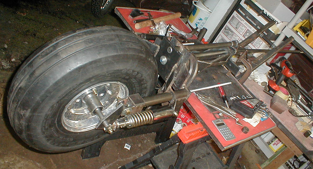 On the the front wheel. This is a 200 mph rated aircraft tire for a large aircraft. Significantly heavier than a conventional motorcycle tire, but I needed larger tires than were currently available for motorcycles. So time to improvise. Aircraft tires are the only other major tires that have rounded profiles. I will cut treads into the tire later. The rim is a split rim for racing dune buggies - or something like that, I can't recall. Don't try this at home.