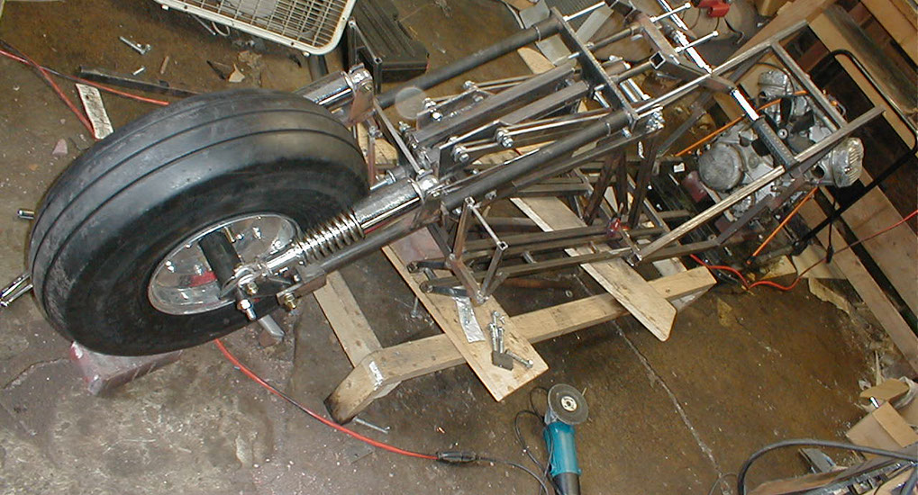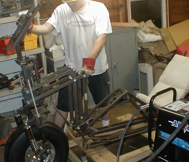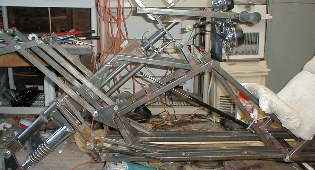 Now it's coming together. Note the upper virtual pivot point bars cradling the sides of the mini steering column for the handlebar mount. Cut, weld, reinforce, good to go.
