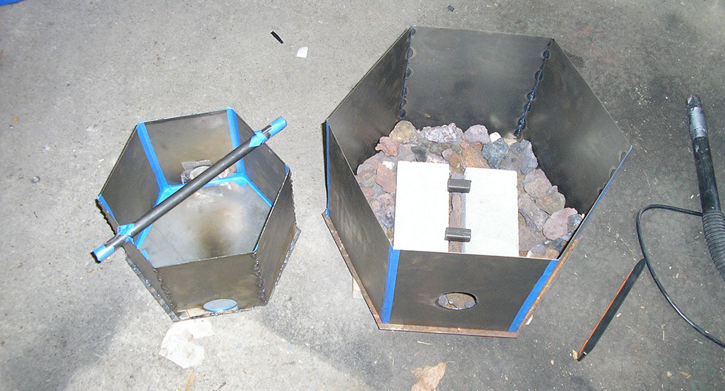 Building the inner cabinet. I wanted a lightweight yet thermally insulative kiln. I recalled how the Romans used pumice in the concrete of the ceiling of the Pantheon, and thought that was a great idea. Filled the base of the kiln with lava rocks.