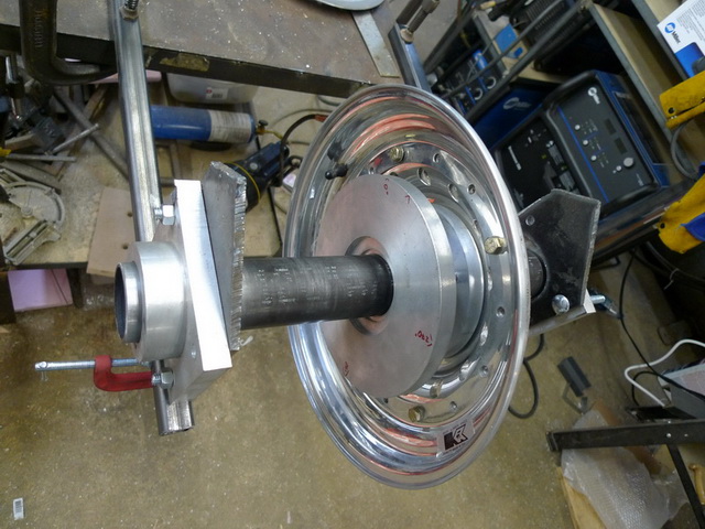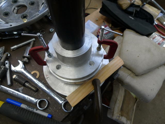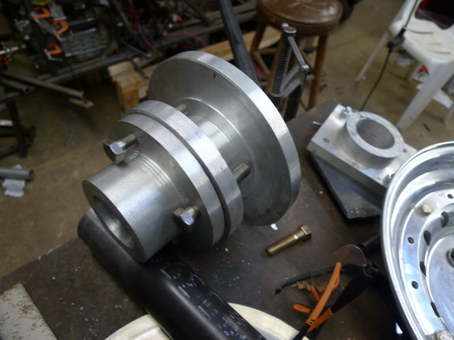 This is only the small half however, and I still needed to drill the lug bolt holes in the larger half, so I lined them up together with the central hub piece keeping them in line
