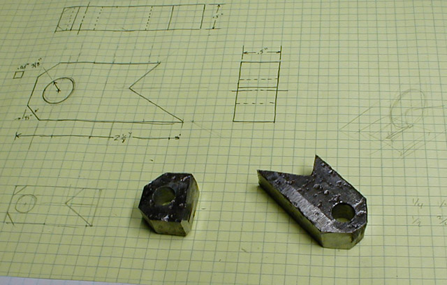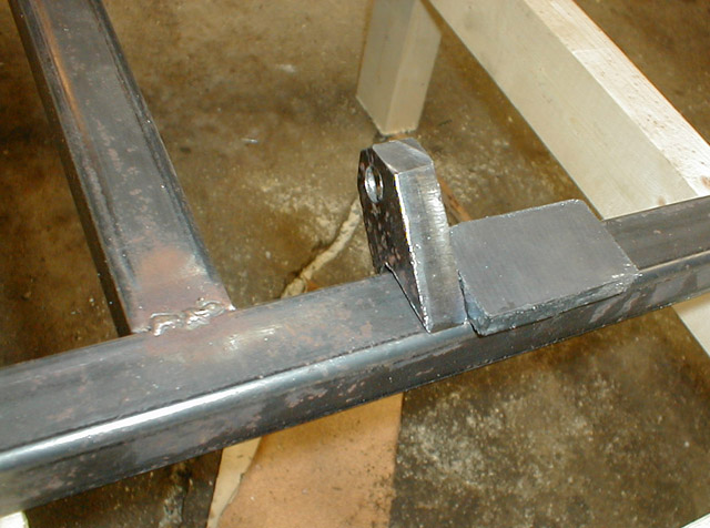 The completed lower front engine mounting brackets. These were made from .5 x 1 inch mild steel. The drilled hole is 3/8" diameter, and was quite a pain to drill with my tools.