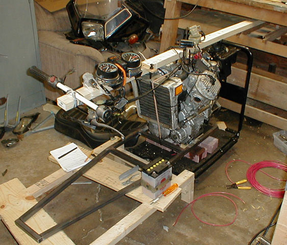 A 2x4 is suspended above the engine and the rest of the components are added. This step is just to verify the functionality of the engine. Once the engine is set, everything will be removed and construction will continue.