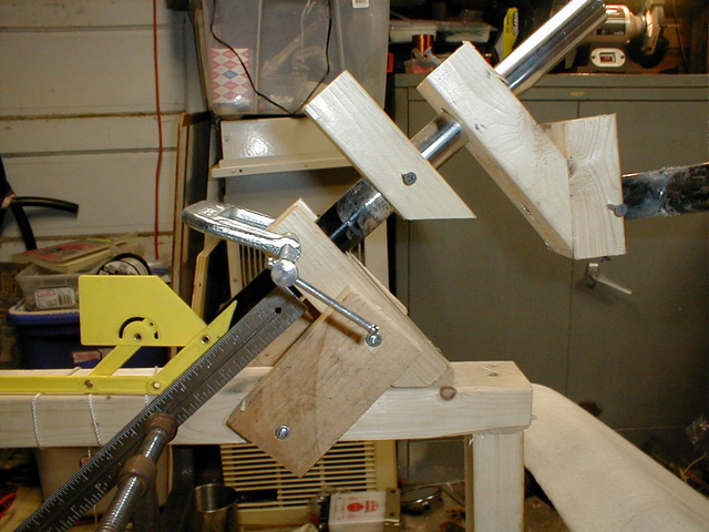 I certainly didn't want to have the whole bike finished, and then sit in it only to find it quite uncomfortable. That being said, I still haven't done any 'extended sitting' tests. I was glad I went through this effort, as the angles and dimension I guessed at were quite off from a comfortable head supporting seat, and some major changes had to be made in the design to accommodate the new data. With that information in mind, I went ahead and decided to build a complete 'ergonomic' mockup of the bike, that is, where I would sit, foot rests, and steering column and handlebars. Here you can see one of the foot rests made of wood to test its location and size.
