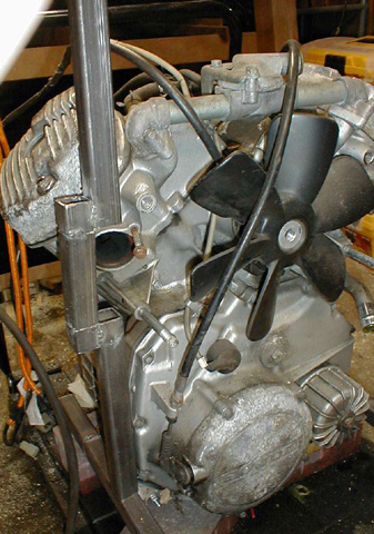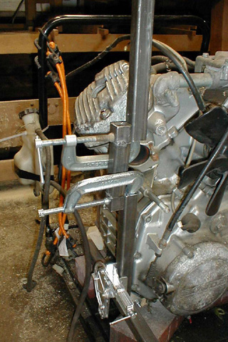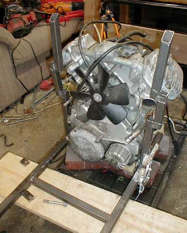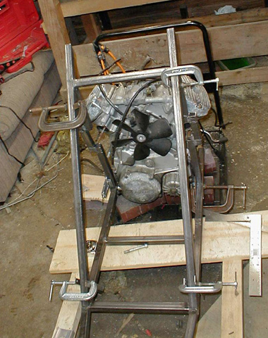 Here the first piece of the rear of the frame has been cut and mounted, it is held up against the engine in place to check sizing and positioning.