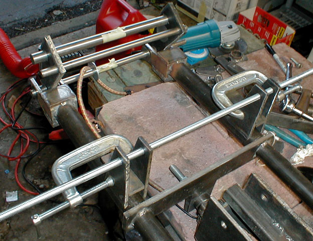Here the suspension mounts are jigged, aligned, and ready for welding.