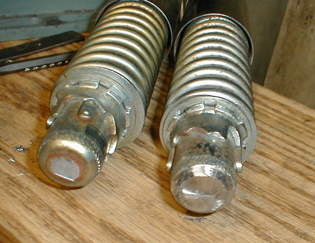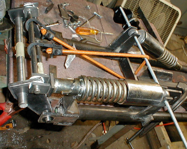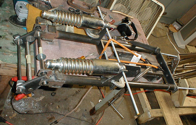 The front suspension, here the bottom links were cut off and then the surface grounded, preparing them for the new links to be welded on. These suspension units are from the rear of my Honda 500.
