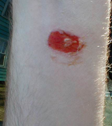 Next is one of the many injuries I have received during this project. Word of warning, be careful of any welding gloves or heat resistant gloves not covering enough of your forearm! Ironically, not more than a few weeks later I received an almost identical burn / cut on my other arm in almost the same place in a totally different manner. While healing I looked like I survived an attempted crucifixion.