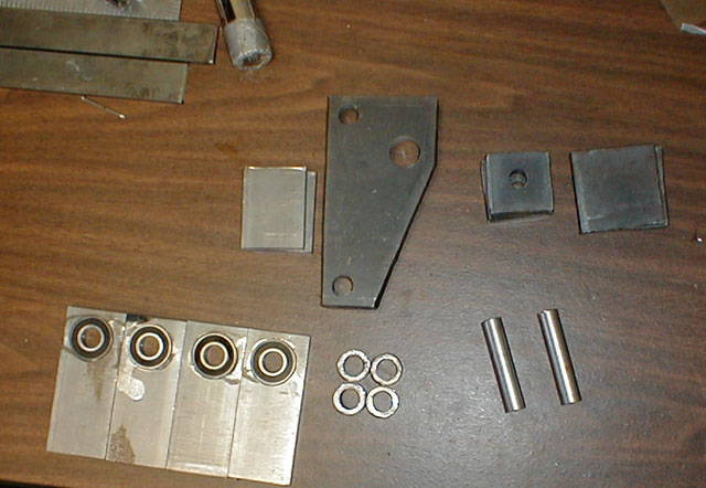 Here are some of the major components ready. The four pieces on the left the ones being drilled above now with bearings inside. In the bottom middle are the spacers, to the bottom right are the 'axles' for where the fork connects to the leading links. In the middle are the actual links.