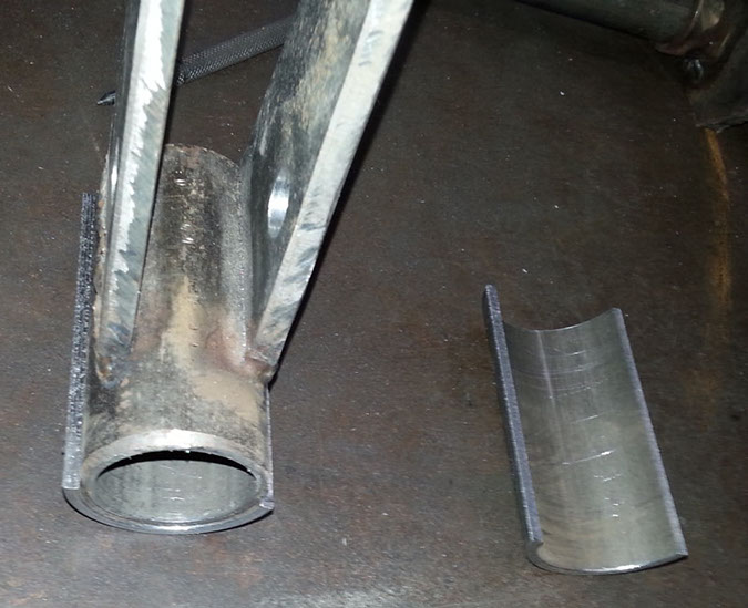 Here is the collar and the half tube temporarily held onto the fork with magnets, showing where they will get welded on