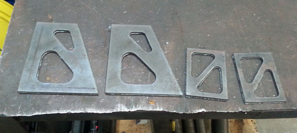 Cutting the triangular holes out retains most of the strength and stiffness but removes a large portion of the weight. Ideally the thick plates that make up the fork itself could have triangulated holes removed, but I don't feel it is necessary for the prototype. Designs can be perpetually refined but at some point you must stop and say "It's good enough" or you'll never finish anything. Next, cutting the plates.