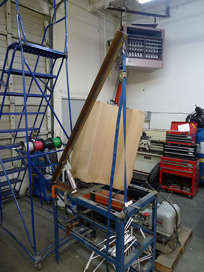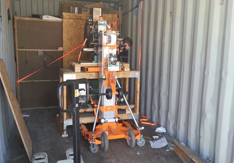 The two hardest things to move were the milling machine and lathe, here we are moving the milling machine out of the container. The orange thing is a hand cranked lift, like a pallet jack, except it can go 16' in the air, although in this case it only needs to go 3' to get under the milling machine. My mill and lathe had not left my storage container since I moved to Washington, as I had access to a larger mill and lathe at Crazy Horse.