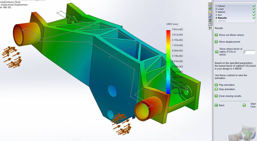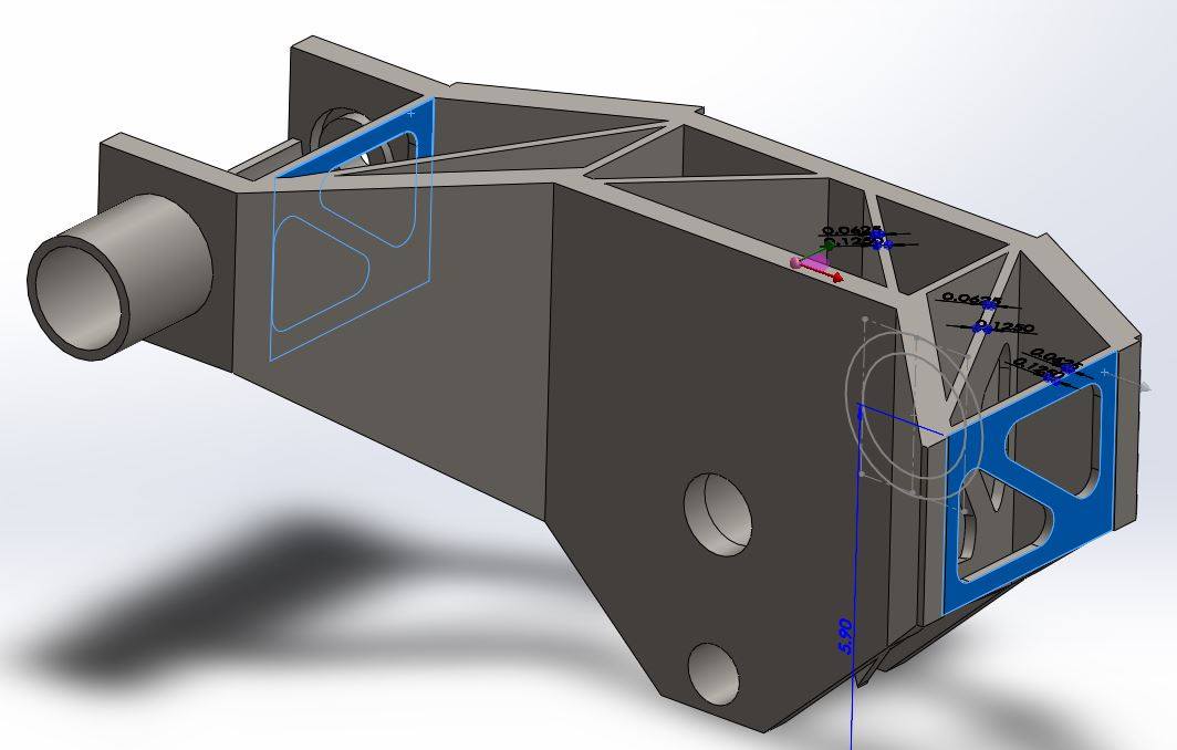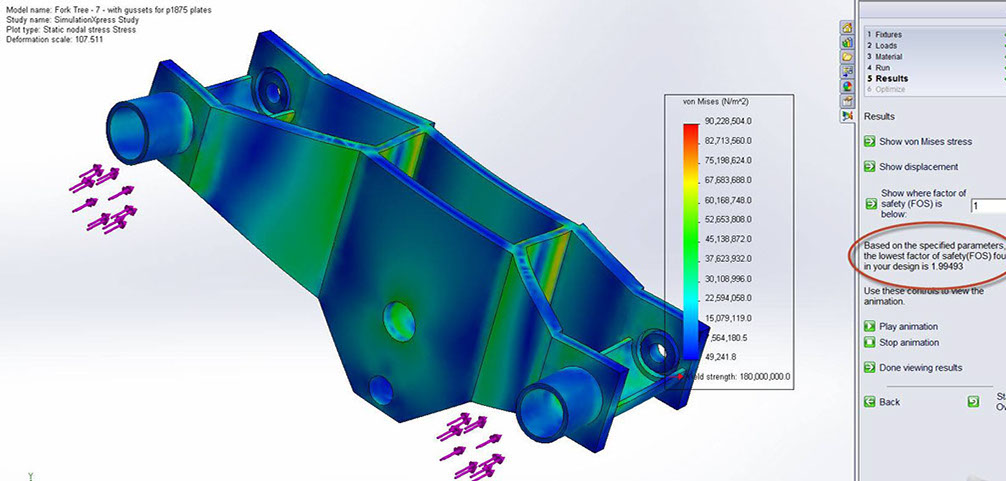 After some additional rounds of modeling and simulations for the fork, I added triangulated gussets. These added about 3lb of weight, but increased the safety factor from 2 to 4.5. I later cut triangles out of the plates to drop it to a FOS of about 4 but dropped the additional weight down to about 1lb.