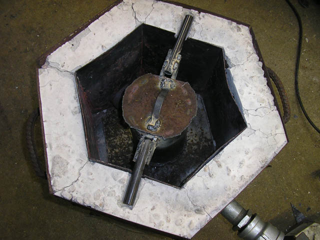 Well, time to make a new crucible. This one made it through about 100 pours, which is pretty good considering it was made out of 1/8" thick steel. My Kiln wasnt looking to great by this time either, all those heating / cooling cycles warped and cracked everything. But again, for 100+ pours, its in pretty good shape.
