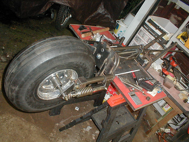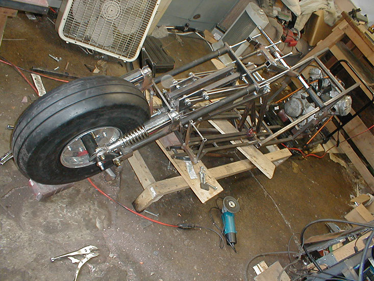 On the the front wheel. This is a 200 mph rated aircraft tire for a large aircraft. Significantly heavier than a conventional motorcycle tire, but I needed larger tires than were currently available for motorcycles. So time to improvise. Aircraft tires are the only other major tires that have rounded profiles. I will cut treads into the tire later. The rim is a split rim for racing dune buggies - or something like that, I can't recall. Don't try this at home.
