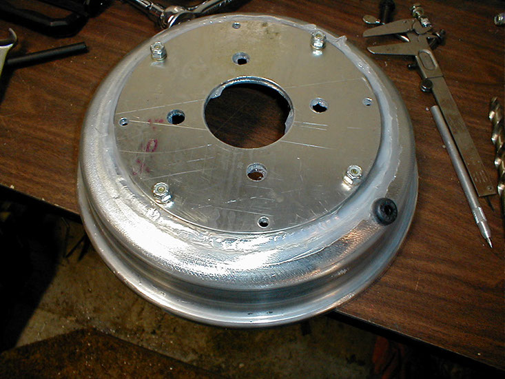 Testing fit. Mounting plate bolted to rim (just two bolts here)