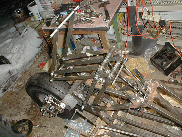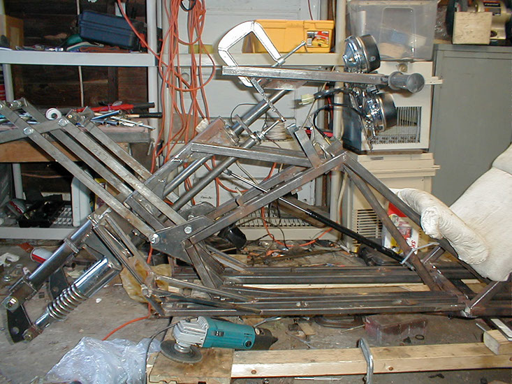 Now it's coming together. Note the upper virtual pivot point bars cradling the sides of the mini steering column for the handlebar mount. Cut, weld, reinforce, good to go.