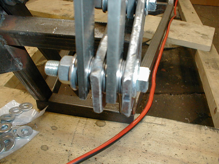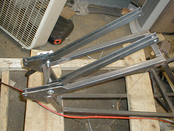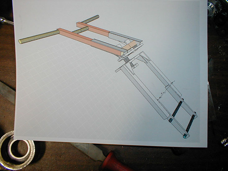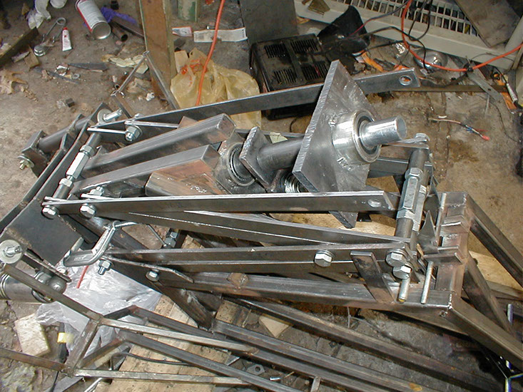 Speaking of the virtual pivot point, based on single 1" x 1/4" cold rolled steel bars, it had too much lateral flexibility. I doubled the bars up and added real thrust bearings.