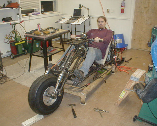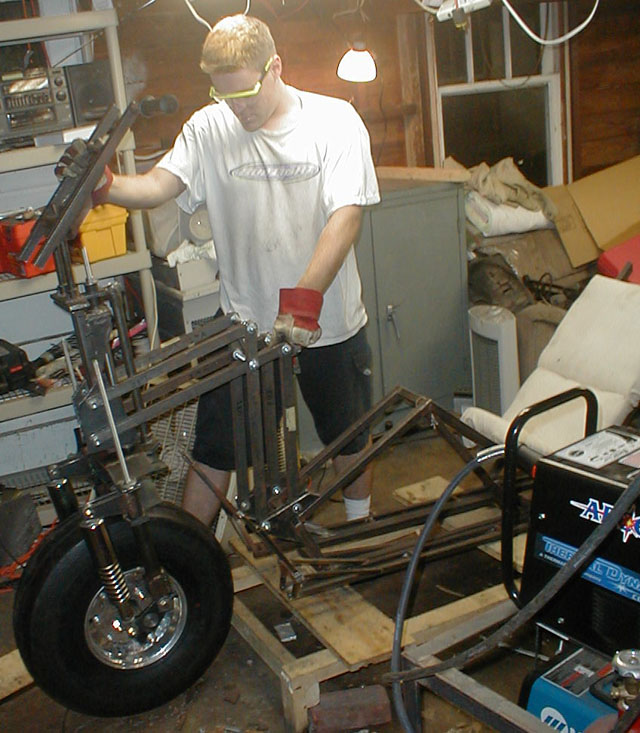 Here you can get a better idea, my brother is checking out the old VPP assembly, note the steering column and handlebars all rise up.