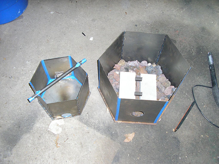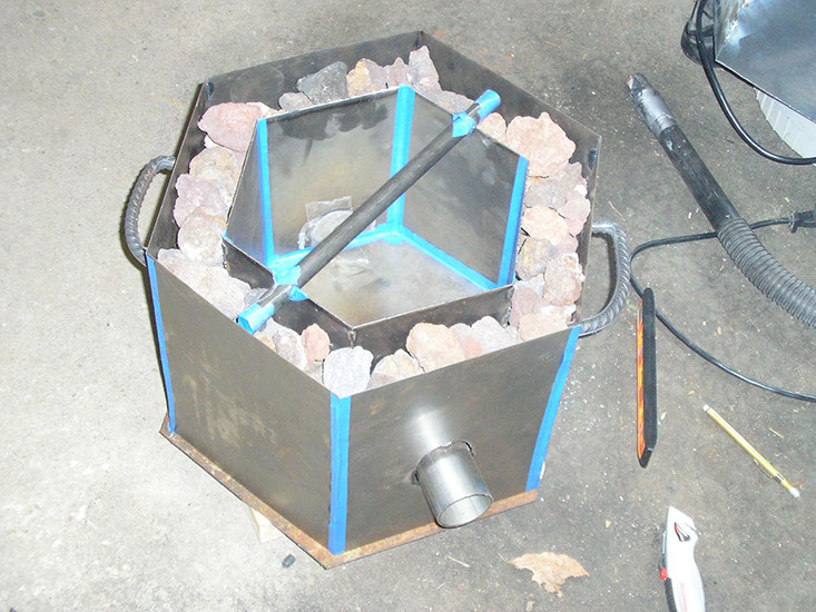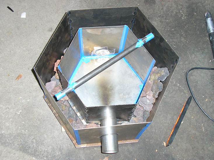 Building the inner cabinet. I wanted a lightweight yet thermally insulative kiln. I recalled how the Romans used pumice in the concrete of the ceiling of the Pantheon, and thought that was a great idea. Filled the base of the kiln with lava rocks.