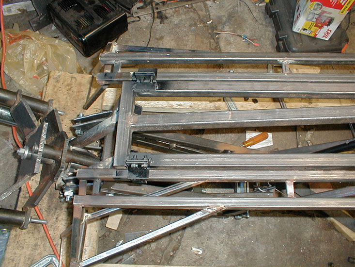 The inner pieces here weld to the frame, the outer rotate when pulled on and will have the caster stands mounted. So they will swing down and touch the ground when you come to a stop.