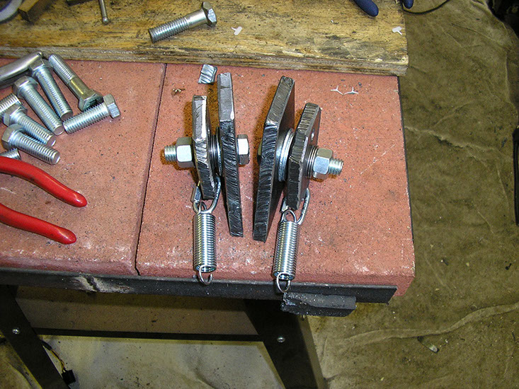 A better view. So obviously the control cable will pull the link up, and that will pull both sides of the center stand up. I added tension springs under the idea that if you are on a slight sideways incline, the side angling down the hill would get slightly more force applied, and be more likely to hold you at an absolute vertical to the ground, instead of a relative vertical.