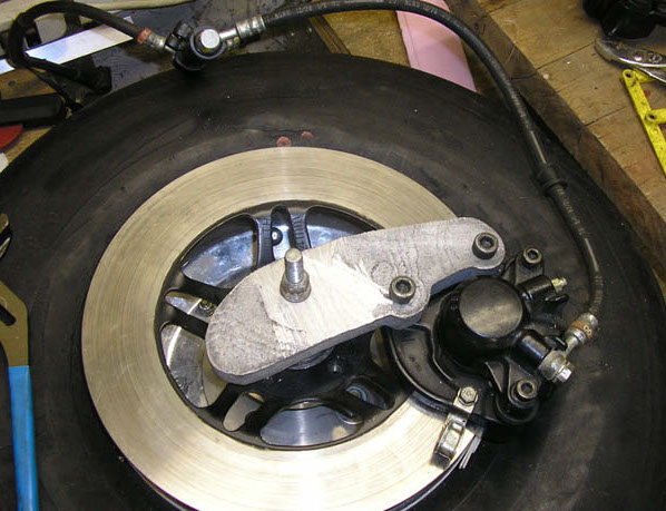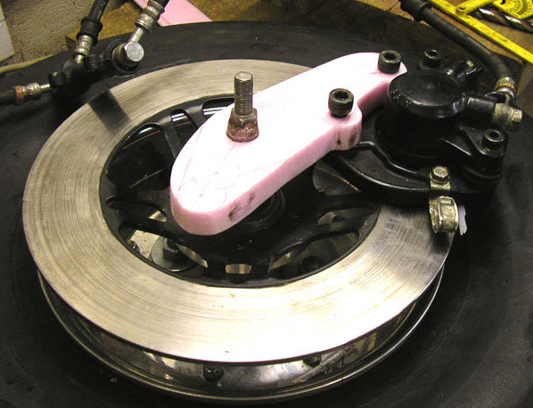 I decided I was not happy with the steel 1/4" caliper mount, or the welded fork front ends. Now that I had a kiln, I decided to make these parts out of Aluminum. First up, new caliper mounts. To start with, I designed the caliper mounts and cut them out of pink polystyrene foam on the hot wire foam cutter. I mounted these on the spindle with the brake caliper to make sure everything lines up properly.