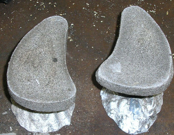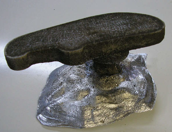 The polystyrene pattern is buried in a sand box, with the flue sticking out. Once the aluminum was melted, it was poured into the sand, evaporating the foam and filling in the space once occupied by the foam.