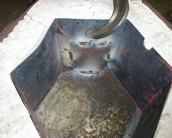 Well, time to make a new crucible. This one made it through about 100 pours, which is pretty good considering it was made out of 1/8" thick steel. My Kiln wasn't looking to great by this time either, all those heating / cooling cycles warped and cracked everything. But again, for 100+ pours, its in pretty good shape.
