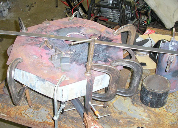 The lid needed some serious repair, here is the lid inverted, I have all the edges clamped together and started welding C's out of angle iron around each face.
