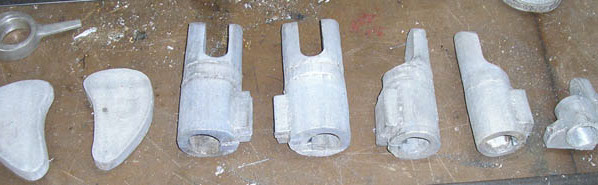 So back to work, I spent an afternoon casting and now had all the parts necessary for making the front end. From left to right are the leading links, a new pair of fork mounts and the old pair (I recast the fork mounts in a sturdier version, in case the single sided mounts were not strong enough) and the finally is one of the suspension mounts. The last suspension mount is not in this picture.