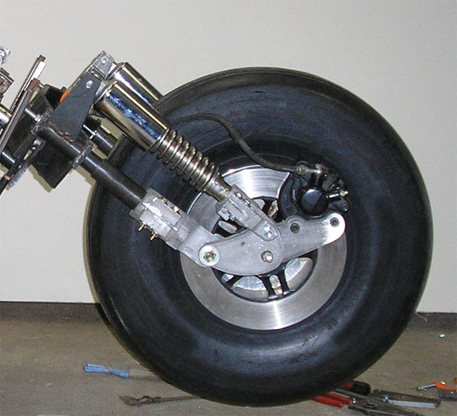 These parts, which are the caliper mounts, are able to freely rotate around the spindle. When the calipers grab the brake rotors, they are pulled forward with the rotating wheel. The reason for this is because on my type of suspension you can utilize the force to counteract the tendency for a motorcycle to pitch down during braking from the weight transfer. Check out the video here https://youtu.be/3Rvm_isw3SA After spinning for a second, the brakes are applied, and you see the caliper dragged forward with the rotor. This leverages against the torque bar and forces the leading link to extend outward. When adjusted properly, this can diminish or exactly cancel the tendency to dive under braking.