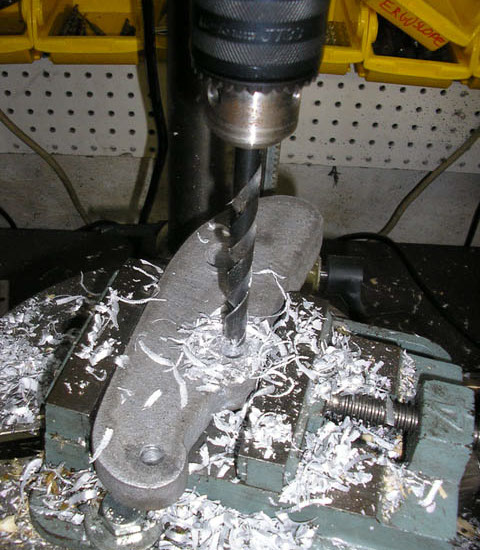 After cleaning the part, I drill out the holes to mount the caliper and for the spindle.
